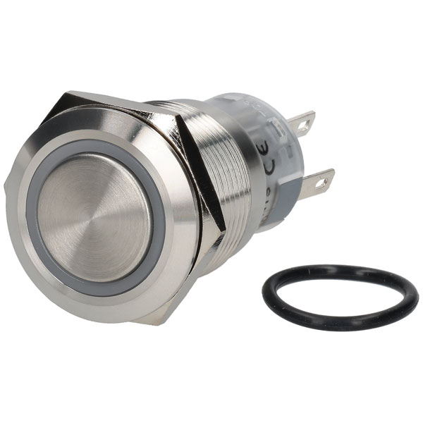 This 19mm stainless steel vandal resistant SPDT latching switch has a flush operating button and features a red, green or blue (RGB) LED illuminating ring that can be addressed individually.