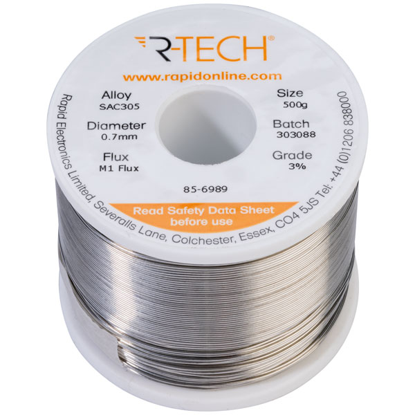 R-TECH 856989 SAC305 Solder 3% M1 Flux is a high purity, lead-free, no clean solder wire. It has a fast flow (3%) flux core.