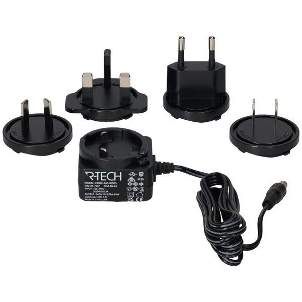 This compact designed R-TECH 24VDC 0.25A power adapter is supplied with four interchangeable heads that are suitable for UK, European, USA and Australian socket types.