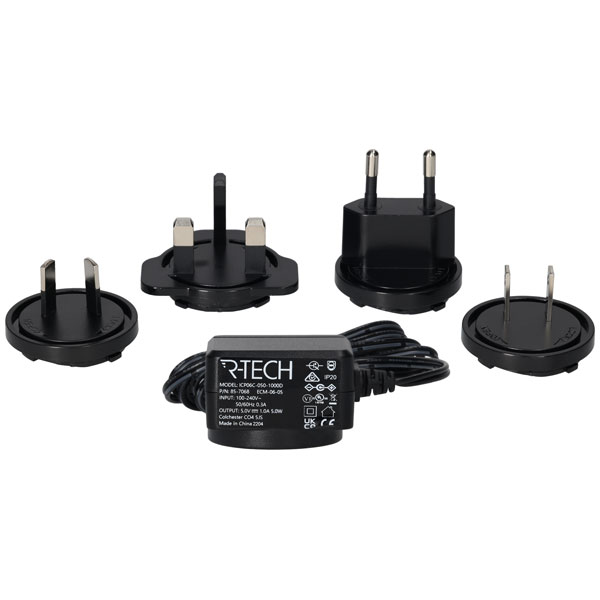 This compact designed R-TECH 5VDC 1A power adapter is supplied with four interchangeable heads that are suitable for UK, European, USA and Australian socket types.