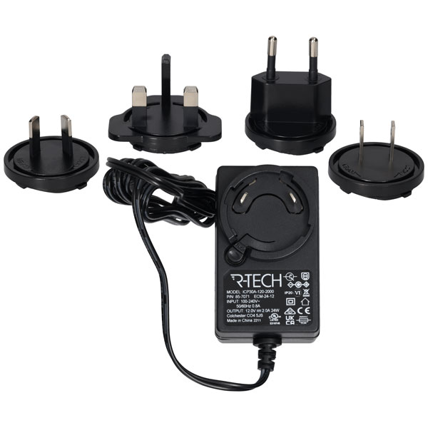 This R-TECH 12VDC 2A power adapter is supplied with four interchangeable heads that are suitable for UK, European, USA and Australian socket types.