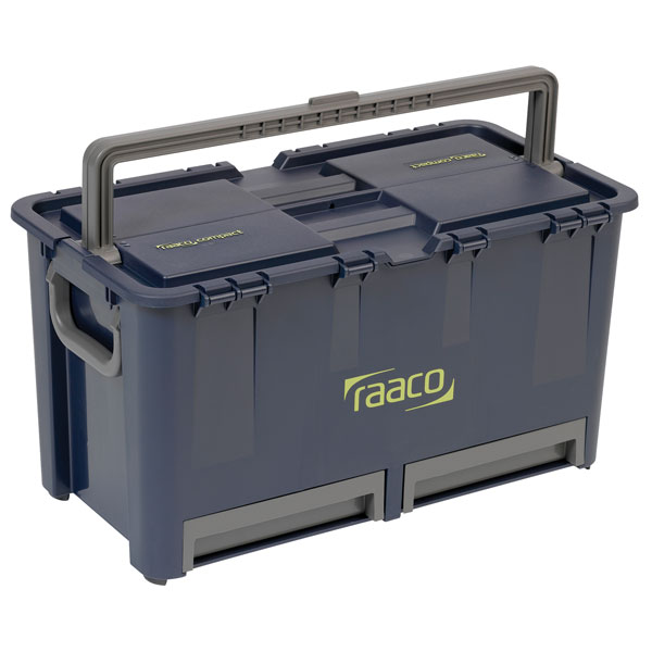 The Raaco Compact 47 Toolbox is made of rugged polypropylene (PP) and has a removable inner tote tray plus 2 drawers in the base for small items. The versatility of the tote tray and drawers can be enhanced by adding compartment inserts to further divide up the space.
