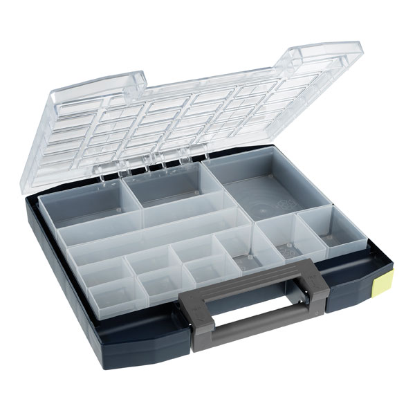This box is equipped with a selection of 14 replaceable inserts from the range. The box is equipped with a grid in the bottom which, together with the O-profiles in the lid, hold inserts and their contents in place during transport.