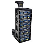 The Raaco CarryMore Trolley + CarryMore 80 storage and transport system comes complete with 4 CarryMore 80 units. Both the trolley and CarryMore units are equipped with an ergonomic handle, to ensure a good grip. The CarryMore units have a connecting lock-mechanism to link together several units.