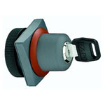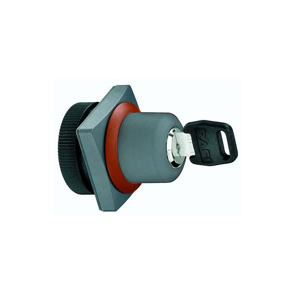 A key switch from Rafi. Form L switches can be turned to 0 and 90°, form V switches can be turned to ±45°. Numbers in brackets indicate key removal positions, i.e. (0+1) means the key can be removed in both position 0 and position 1. This switch is protected to IP65.