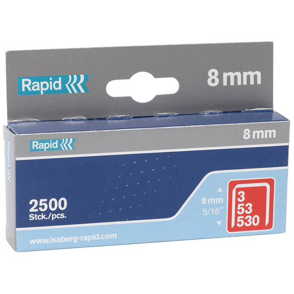 Rapid No. 53 precision cut fine wire staples are made from high performance galvanised steel for strength and durability. The fine wire makes the fixed staple almost invisible, ideal for fabrics, decoration, small construction and light repair.