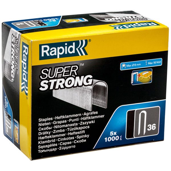 Rapid No. 36 precision cut, high-performance steel flat wire cable staples with rounded crown designed for securing low voltage cables up to a maximum of 6mm in diameter. The staples are made from strong galvanised wire with diverging points (DP), which makes the leg points go in opposite directions for extra strong bonding.
