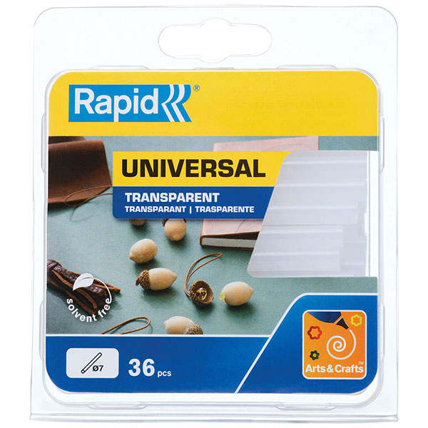 Multipurpose glue sticks ideal for use with wood, leather, fabrics, cork, plastic materials and cardboard. Available in transparent or white and in a variety of diameters and lengths. Ideal for use with Rapid Glue Guns, check your glue gun for the size of glue stick required.