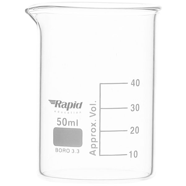 Rapid EGL0126D Glass Beakers, Low form with Spout, 50 ml is a low form beaker made of Borosilicate 3.3 Glass. This beaker features white graduations every 10ml and spout for easy pouring. Uniform walls provide excellent strength against breakage.