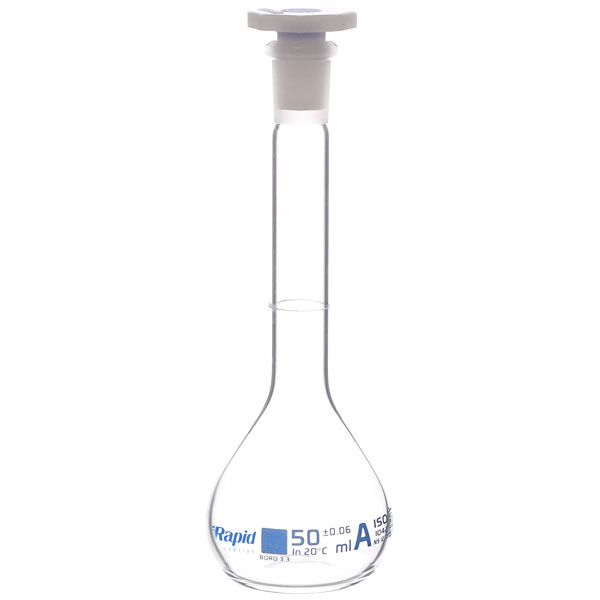 Rapid EGL0446D Volumetric Flask with PE Stopper, Class-A, 50 ml borosilicate glass volumetric flask fitted with chemical resistance polyethylene stopper.