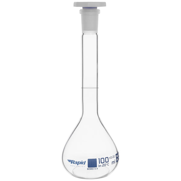 Rapid EGL0448E Volumetric Flask with PE Stopper, Class-B, 100 ml Borosilicate glass with one graduation mark. Fitted with chemical resistant polyethylene stopper. Blue graduation. Cap. 100 ml, Tolerance ±0.20 ml, Socket size 14/23