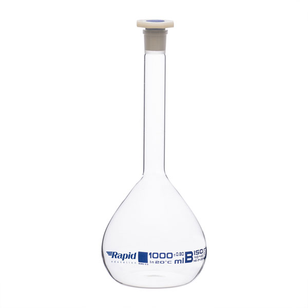 Rapid EGL0448I Volumetric Flask with PE Stopper, Class-B, 1000 ml with one graduation mark. Fitted with chemical resistance polyethylene stopper. Cap. 1000 ml, Tolerance ±0.80 ml, Socket size 24/29