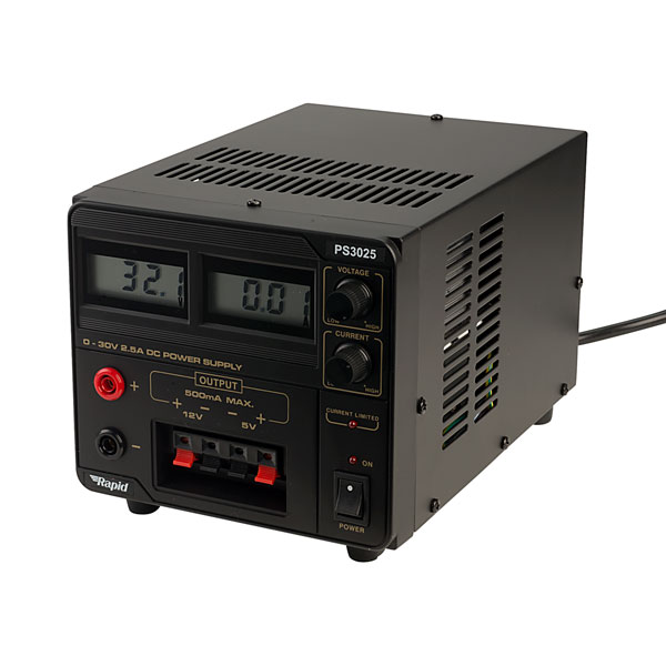 The Rapid PS3025 is a high quality, fully regulated, power supply capable of supplying up to 30V at a maximum of 2.5 amps with additional fixed 5V and 12V outputs at 500mA.