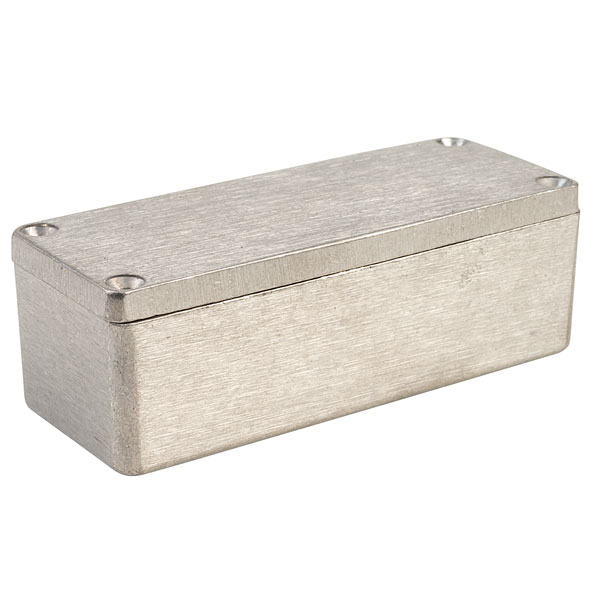 Sealed die cast aluminium enclosure, 90 x 36 x 30mm, with natural aluminium finish, ideal for use in industrial or automotive engineering. Uses neoprene gasket with universal tongue and groove seal system, wall mounting holes and lid fixing screws are located outside the sealing area to avoid compromising sealing protection.
