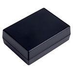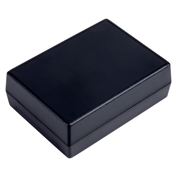 A black plastic project box, 111 x 83 x 38mm, ideal for use as an enclosure for instruments, computer accessories, remote actuators, audio and video controls and security systems.