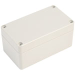 Light grey polycarbonate box, 115 x 65 x 55mm with tongue-and-groove sealing system plus neoprene gasket giving sealing to IP65.
