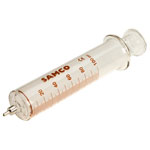 This glass syringe has a Luer fitting, interchangeable pistons and barrels.