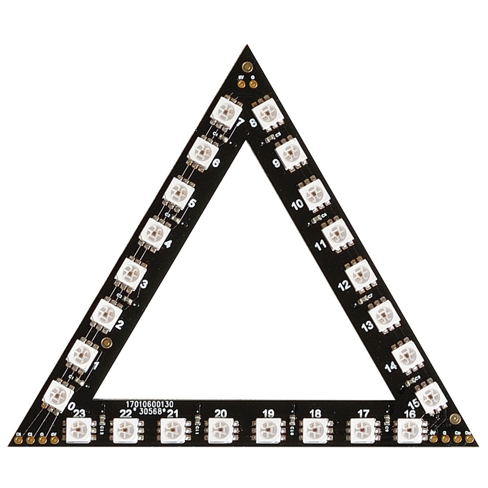 This triangle board has 24x LEDs on a 10cm equilateral triangle with 10mm LED spacing and features SK9822 RGB LEDs. The board is designed with through-holes that enable the use of standard 2.54mm headers, although you can wire them directly should you wish. There are sufficient inputs and outputs so that they can be 'daisy-chained' together.