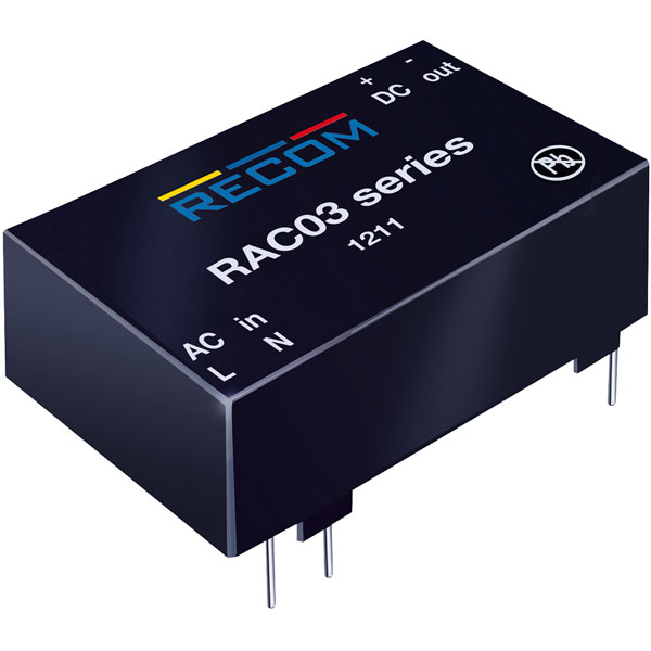 This Recom Single Output AC-DC Power Supply is from the RAC03-SC series. It is a compact, universal input, Regulated Converter module for PCB mounting. It features high efficiency, low standby power, high operating temperature, soft start and short-circuit protection as well as a built-in EMC Class B filter.