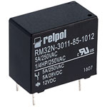 A 12V DC relay from the RM32N series of PCB mounting miniature relays that are designed to handle high loads up to 5A. The small dimensions and light weight makes this relay ideal for use in domestic equipment, automation systems, electrical equipment, instrumentation and metering, telecommunications devices, remote control facilities, light controllers, etc.