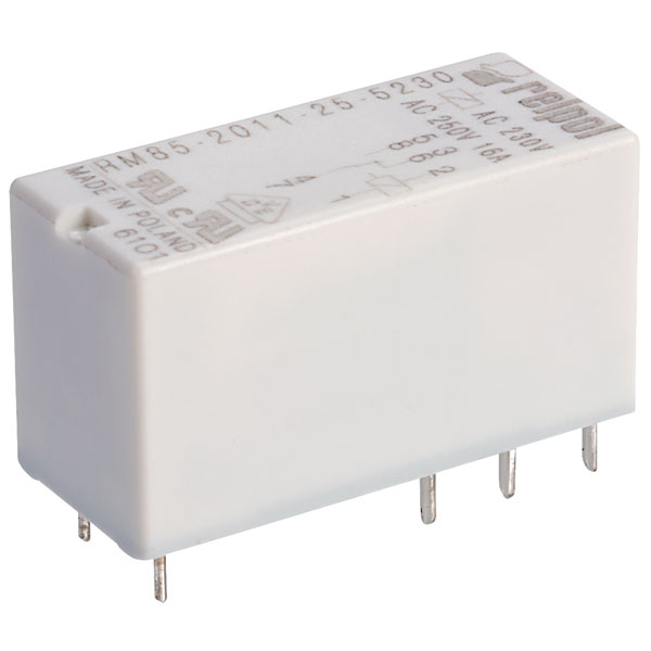 A 16A 230V AC miniature relay from the RM85 series. The relay may be PCB mounted or fitted into a suitable relay socket. Additional features include high power handling and 5000V 10mm reinforced insulation. Suitable for a wide range of applications.