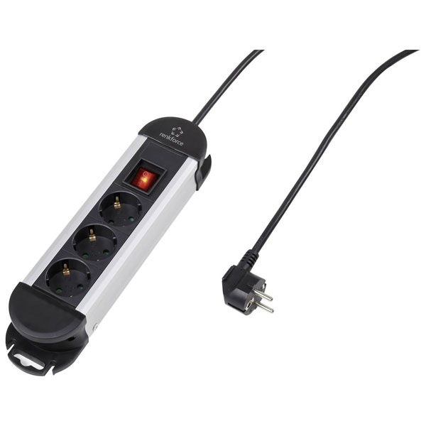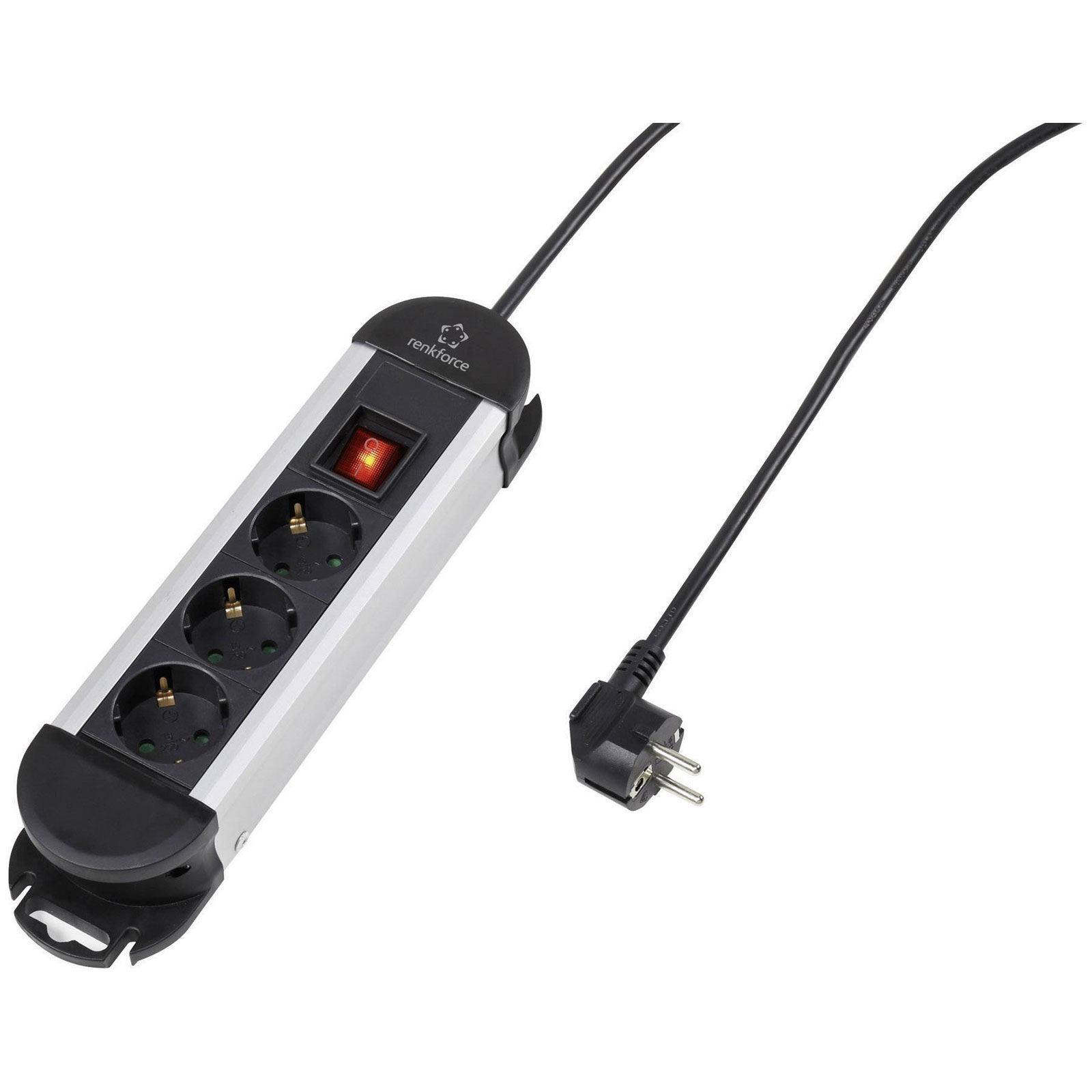 The Renkforce 315A-CMB power strip features three black and silver sockets with a switch, ideal for controlling multiple devices. Manufactured by Renkforce, this power strip is designed with a PG connector for secure connections. It is typically used in office or home settings to manage power distribution efficiently.