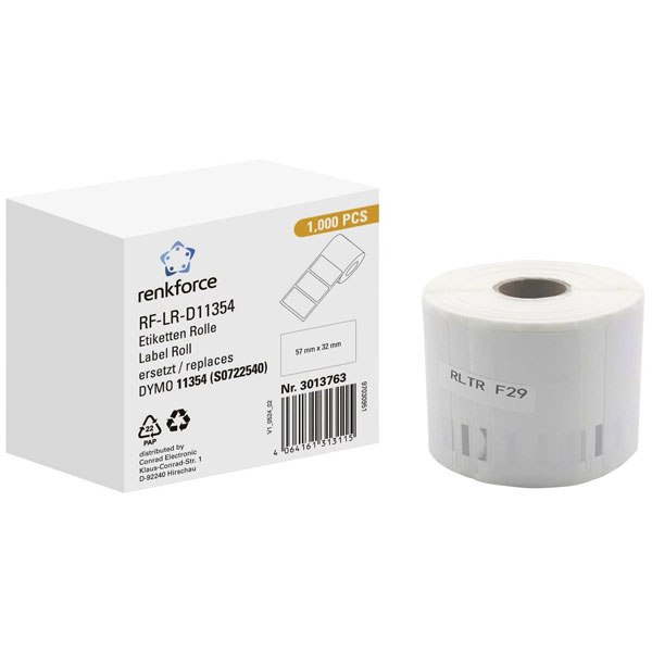 Renkforce RF-6027526 is a label roll part number 3013763 designed for use with label printers. This product offers a roll of 1,000 white paper labels, each measuring 57 mm by 32 mm. The labels feature a permanent adhesive, ensuring they maintain their position once applied, making them suitable for a wide range of applications. These labels are compatible with and can replace DYMO models 11354 and S0722540, providing a versatile solution for organisational and labelling tasks in office environments or product packaging. The durable construction of these labels supports usage in settings requiring clear, reliable identification such as inventory management, logistics, or shipping operations.
