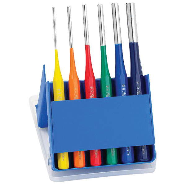 This set of 6 exclusive pin punches from Rennsteig is supplied in a plastic case. It includes multicoloured powder-coated punches with a diameter of 3mm, 4mm, 5mm, 6mm, 8mm and 10mm.