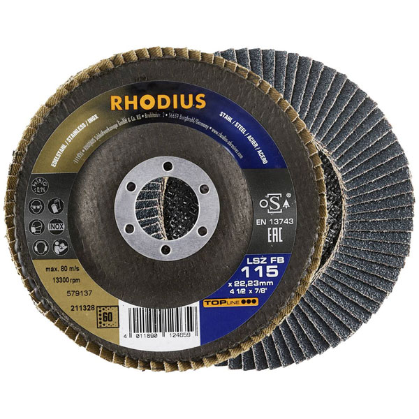Rhodius 211328, also known as 3393937 - Rhodius 211328, is a high-performance flap disc designed for precision and durability in metalworking tasks. This product features a diameter of 115 mm and a bore size of 22.23 mm, optimised for use on stainless steel surfaces. It is engineered to provide efficient grinding and finishing, delivering a consistent surface quality with minimal material removal. Characterised by its robust construction, the flap disc is suitable for various industrial applications, including deburring, edge bevelling, and surface preparation where stainless steel materials are involved.