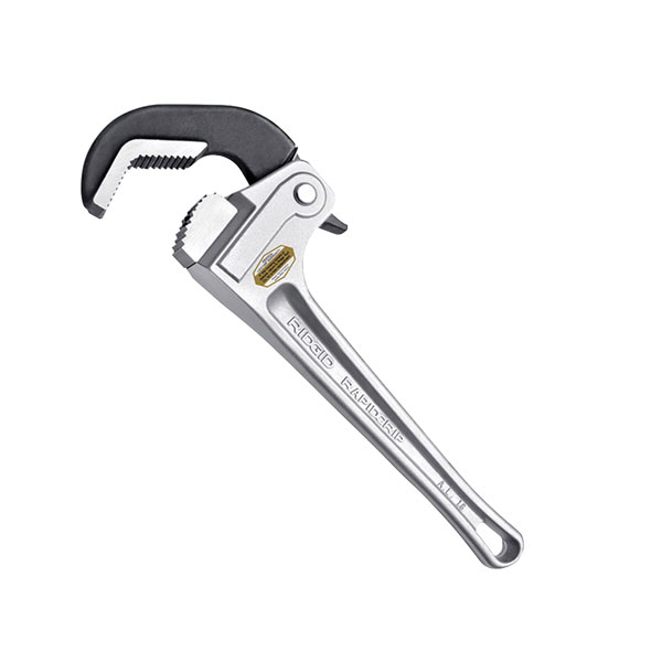The RIDGID Aluminium RapidGrip® Wrench has all the great benefits of the heavy-duty RapidGrip® wrench but it is 35% lighter than heavy-duty models. It offers quick one-handed operation with a spring-loaded jaw design that provides a rapid ratcheting action. The unique combination heel/hook jaw design bites the workpiece aggressively and ensures a secure grip.