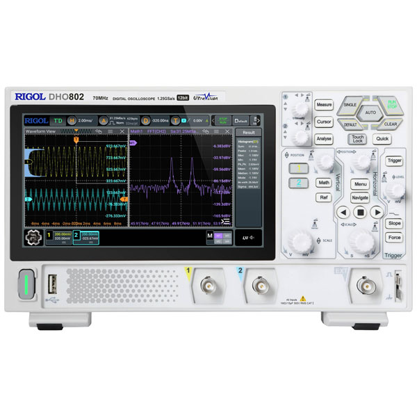 Rigol's DHO802 is a digital storage oscilloscope featuring a 70 MHz bandwidth and a 1.25 GS/s sampling rate. This 12-bit oscilloscope is ideal for capturing detailed waveforms in electronics development and testing. It is commonly used for signal analysis in research, education, and engineering applications.