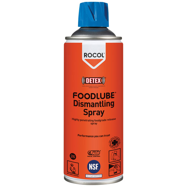 This FOODLUBE Dismantling Spray from Rocol is a non-toxic, fasting-acting penetrating lubricant for corroded threaded fasteners and other seized components. Short-term corrosion protection is provided by a light, residual film. This spray is NSF H1 registered for incidental contact with food, making it ideal for use in the catering, pharmaceutical and other clean industries where a non-toxic product is required.