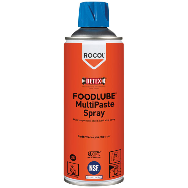 Rocol's FOODLUBE Multi-Paste Spray is a white, non-toxic lubricating spray that applies an anti-seize paste, ideal for use in food, pharmaceutical and other clean environments. It is ideal for the assembly and lubrication of: threads, bushes, slides, small open gears and fasteners and is suitable for use as a food grade drilling, tapping and cutting lubricant, particularly when maintenance has to be carried out in the process area.