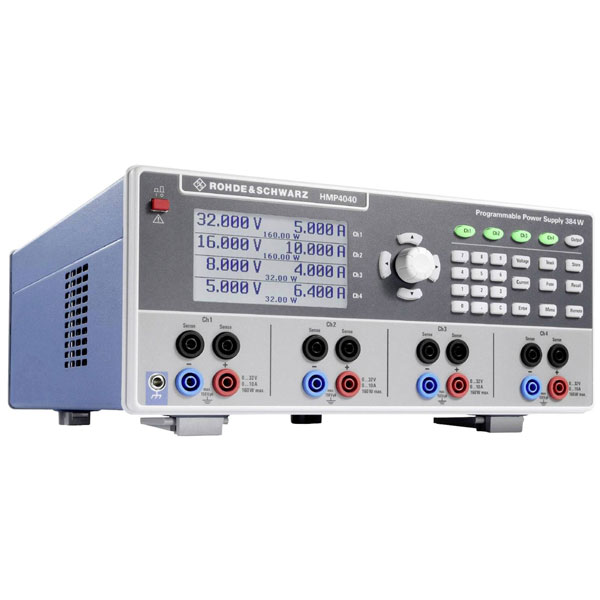 Rohde & Schwarz's R&S®HMP4040COM is a bench PSU with a maximum adjustable voltage of 32 V and up to 10 A output. This programmable power supply unit, with four outputs, offers a total power of 384 W and can be remotely controlled. It is ideal for laboratory, industrial, and educational applications requiring precise voltage adjustments.