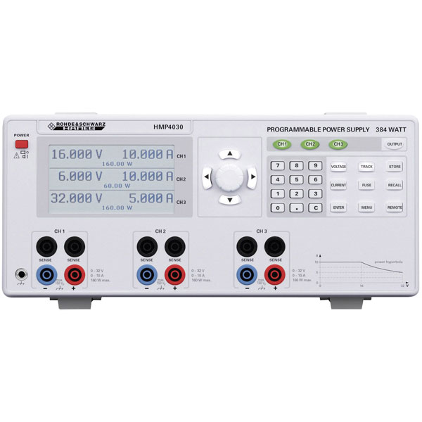 The HMP4030 has three identical channels with a voltage range of 0 to 32V. The instrument can likewise provide an output power of 384W (160W each channel).
