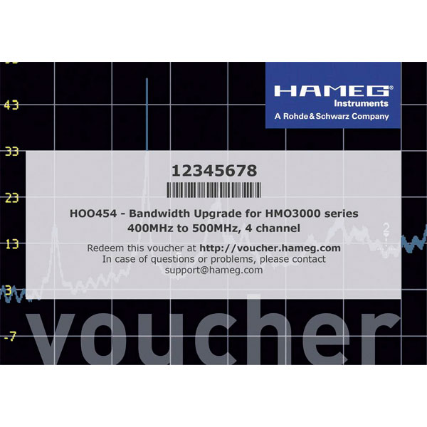 The Rohde & Schwarz HOO454 is a Bandwidth Upgrade Voucher for the HMO3044 4-Channel Mixed Signal Oscilloscope. The upgrade voucher HOO454 allows the 300MHz instrument to be upgraded to a bandwidth of 500MHz.