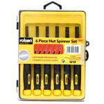 The Rolson 28215 Nut Spinner Set contains 6 miniature nut spinners with soft-grip handles and swivel caps for easy turning.
