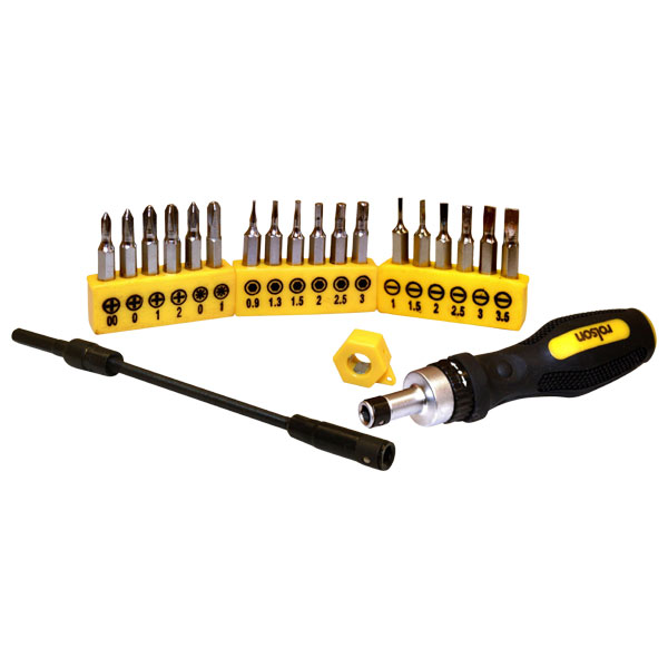The Rolson 28294, 21-piece Precision Ratchet Screwdriver Set consists of a precision ratchet handle screwdriver, 18x 28mm screwdriver bits, a 120mm flexible extension shaft and a magnetizer, in a resealable plastic/rubber case.