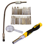 The Rolson 28296, 33-piece Precision Screwdriver and Bit Set consists of a soft rubber grip screwdriver handle, 30x 28mm screwdriver bits, 110mm extension bar, 190mm flexible extension shaft and a 25mm diameter magnifying glass with X3 magnification, in a resealable plastic/rubber case.