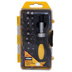 The Rolson 28419, 38-piece Stubby Ratchet Screwdriver and Bit Set consists of a stubby ratchet screwdriver and 36x 25mm screwdriver bits housed in a plastic storage case.