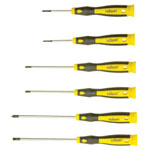 A set of precision screwdrivers with Pozidriv and slotted heads.