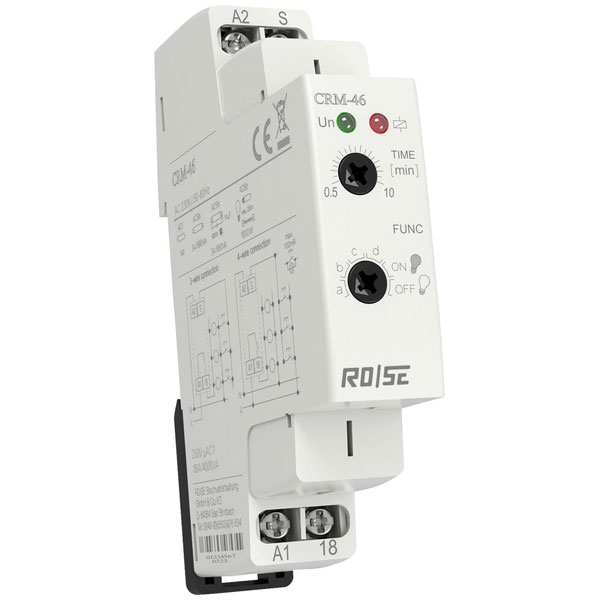 The Rose LM CRM-46 staircase multiway switch operates on 230 V AC and features a time range of 30 seconds to 10 minutes. This multifunction relay, suitable for DIN rail mounting, includes surge protection and timer functionality. It is commonly used for controlling lighting in staircases and similar applications, allowing for convenient, timed illumination.