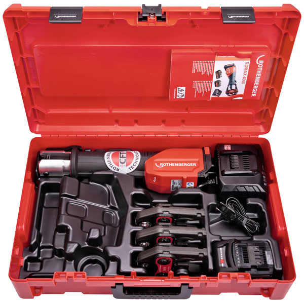 The Rothenberger ROMAX 4000 crimping jaw set includes SV15-22-28 mm sizes, equipped with a 4.0 Ah battery for extended use. Designed for precision and durability, it is ideal for plumbing and HVAC applications. Rothenberger, a trusted manufacturer, ensures reliable performance with this robust tool set.