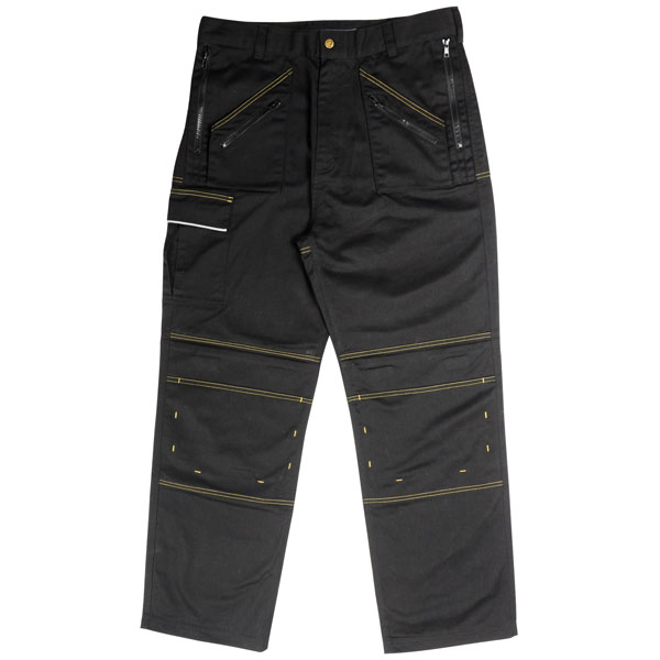 The Roughneck Black Multi Zip Trousers are hard-wearing work trousers made from 240gsm polyester cotton twill. With an assortment of 6 zipped pockets, 2 standard pockets and a hook & loop flapped front leg pocket. In addition, the trousers have a pocket on each knee for knee pads. Complete with a YKK front zip.