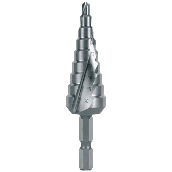 Ruko manufactures the 101051H step drill bit, which features a range of 4 to 20 mm in diameter and a total length of 81 mm. It is designed with a quick-helix construction, ideal for drilling into sheet metal. This high-speed steel tool is commonly used in applications requiring precise, multi-diameter holes.