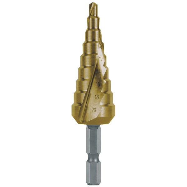 The Ruko 101051TH step drill bit, made from high-speed steel and coated with TiN, features a total length of 81 mm and is designed for precise drilling. Ideal for use in sheet metal, its quick-helix structure ensures efficient operation. This versatile step drill bit ranges from 4 mm to 20 mm, making it suitable for various applications.