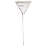 Borosilicate glass laboratory funnels with long stems. The longer, non-tapering stems of these funnels are useful when using funnels with tubing and when mounting them in bungs for use with flasks, bottles and retorts, etc.