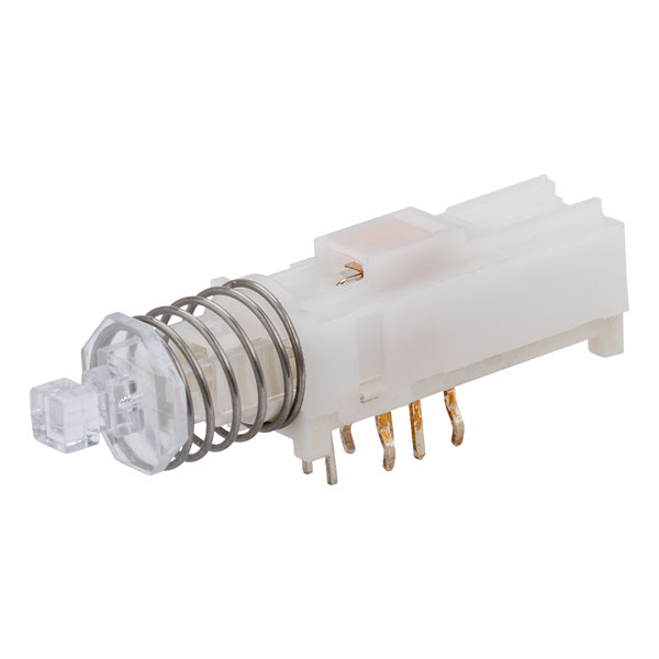 A 2-pole push button latching switch with integral high brightness green LED for right angled PCB mounting. Applications include pro audio and video processing equipment and broadcast and test equipment amplification.