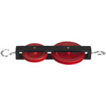 A double in-line pulley, housed in a metal frame with a hook at each end. The 2 pulleys are of different diameters to allow the inner cord to move without obstructing the outer cord.