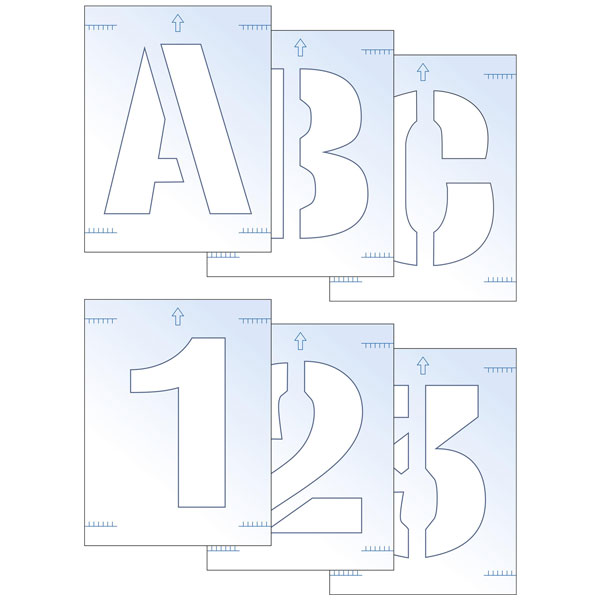 The stencils have letters and/or numbers with identical heights, with varying widths per individual character. The spacer marks in the corners of the stencils allow the user to accurately line up the next character in sequence, ensuring neatness.